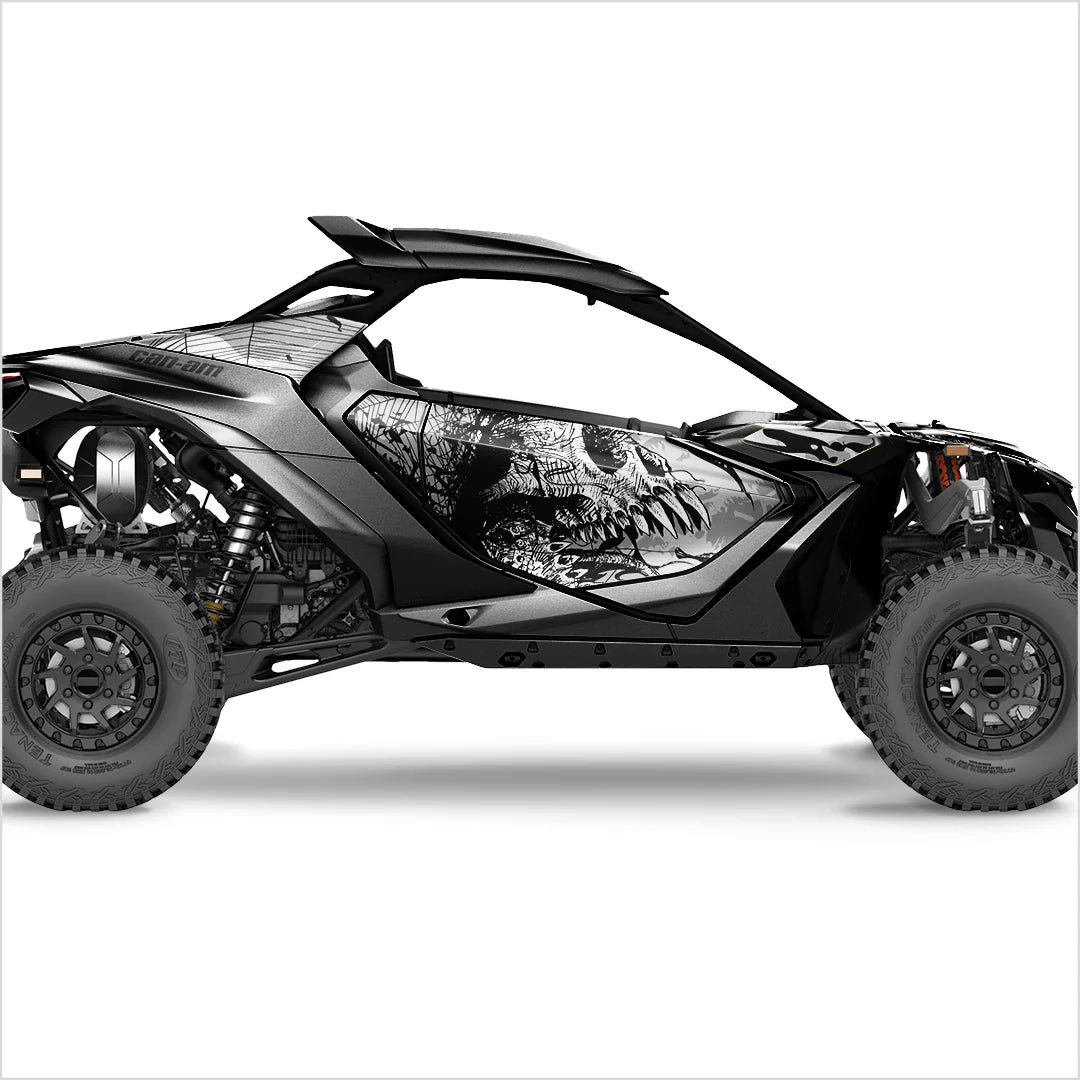 Hochwertige und außergewöhnlich gestaltete Aufkleber speziell für den Can-Am Maverick R (2 Türen) sind für härteste Einsatzbedingungen ausgelegt. Sie können auf ebenen und leicht gewölbten Oberflächen angebracht werden. Dafür kommt ein spezielles Widerstandslaminat zum Einsatz, das einen langfristigen Schutz vor UV-Strahlung, Schmutz, Staub, Kies, Wasser und Kratzern gewährleistet.
