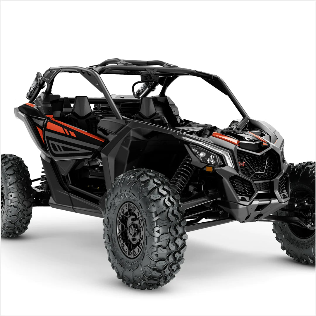 Adesivi di alta qualità e design eccezionale realizzati appositamente per Can-Am Maverick X3 (2 porte e accenti di colore ROSSO bruciante) sono pensati per le condizioni di sfruttamento più difficili. Possono essere applicati su superfici piane e leggermente curve, pertanto viene utilizzato uno speciale laminato resistente, che garantisce una protezione a lungo termine da raggi UV, sporco, polvere, ghiaia, acqua e graffi.