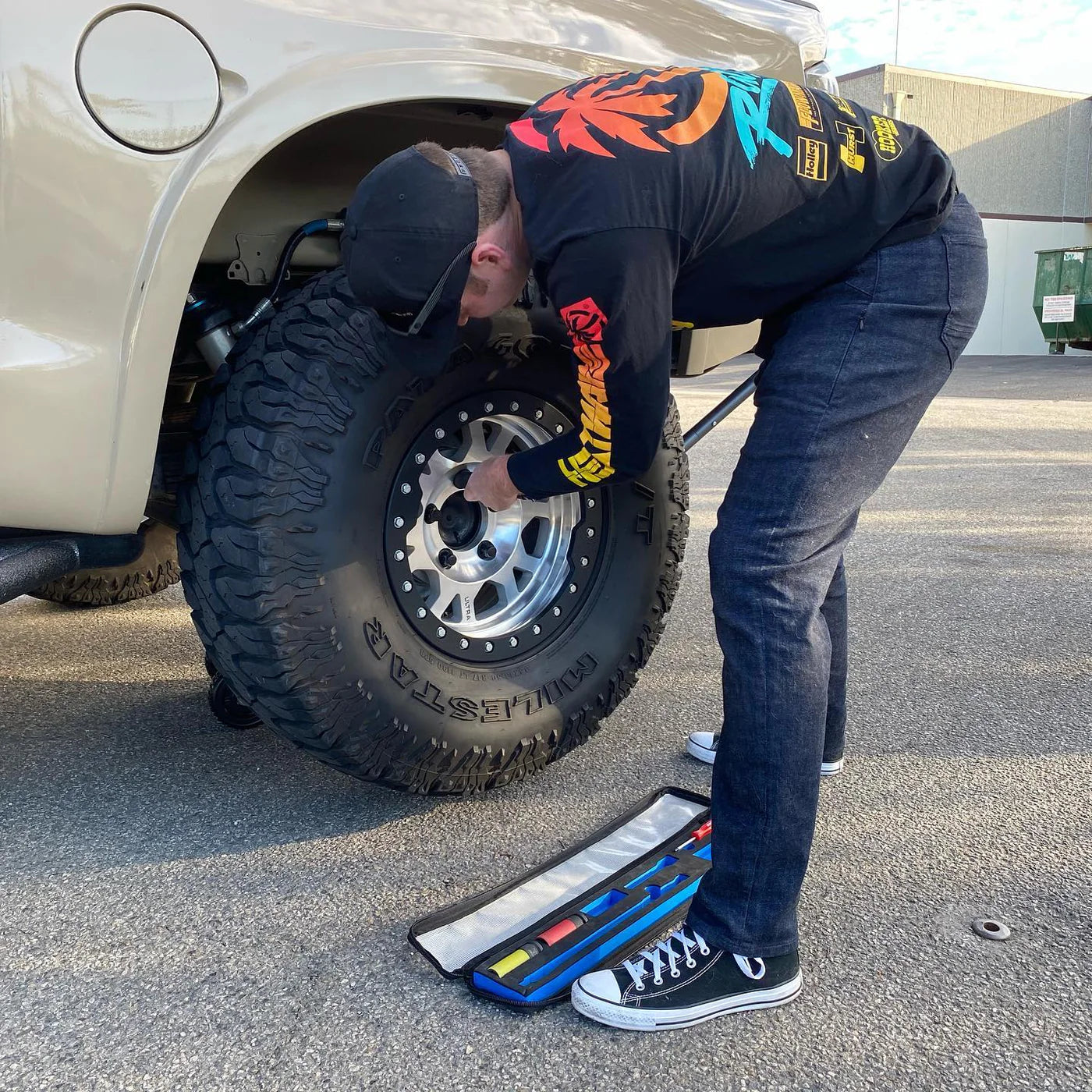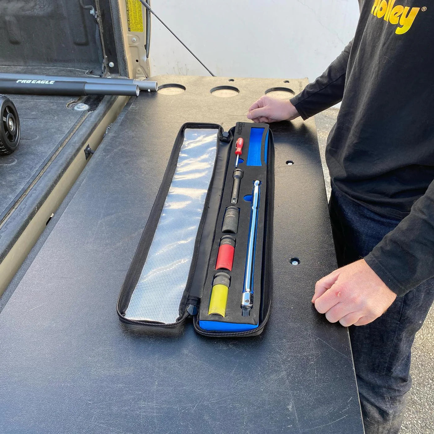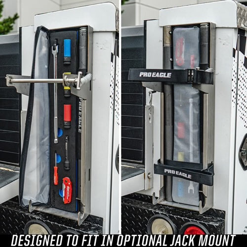 Rozmawialiśmy z naszymi przyjaciółmi w Boxo Tools Razem stworzyliśmy zestaw narzędzi specjalnie dopasowany do naszych uchwytów podnośnika. Zestaw ten mieści się w uchwytach wersji 2.0 pod podnośnikiem. Po zamocowaniu uchwytów i podnośnika w uchwycie, zestaw narzędzi jest ukryty i pewnie zamocowany. Zestaw narzędzi jest idealnym uzupełnieniem każdego montażu podnośnika. Nie daj się utknąć bez wszystkiego, czego potrzebujesz do wymiany opony. Zestawy narzędzi do pojazdów o udźwigu 1,5, 2 i 3 ton są dopasowane rozmiarem do każdego mocowania. Wszystkie zestawy zawierają te same narzędzia.