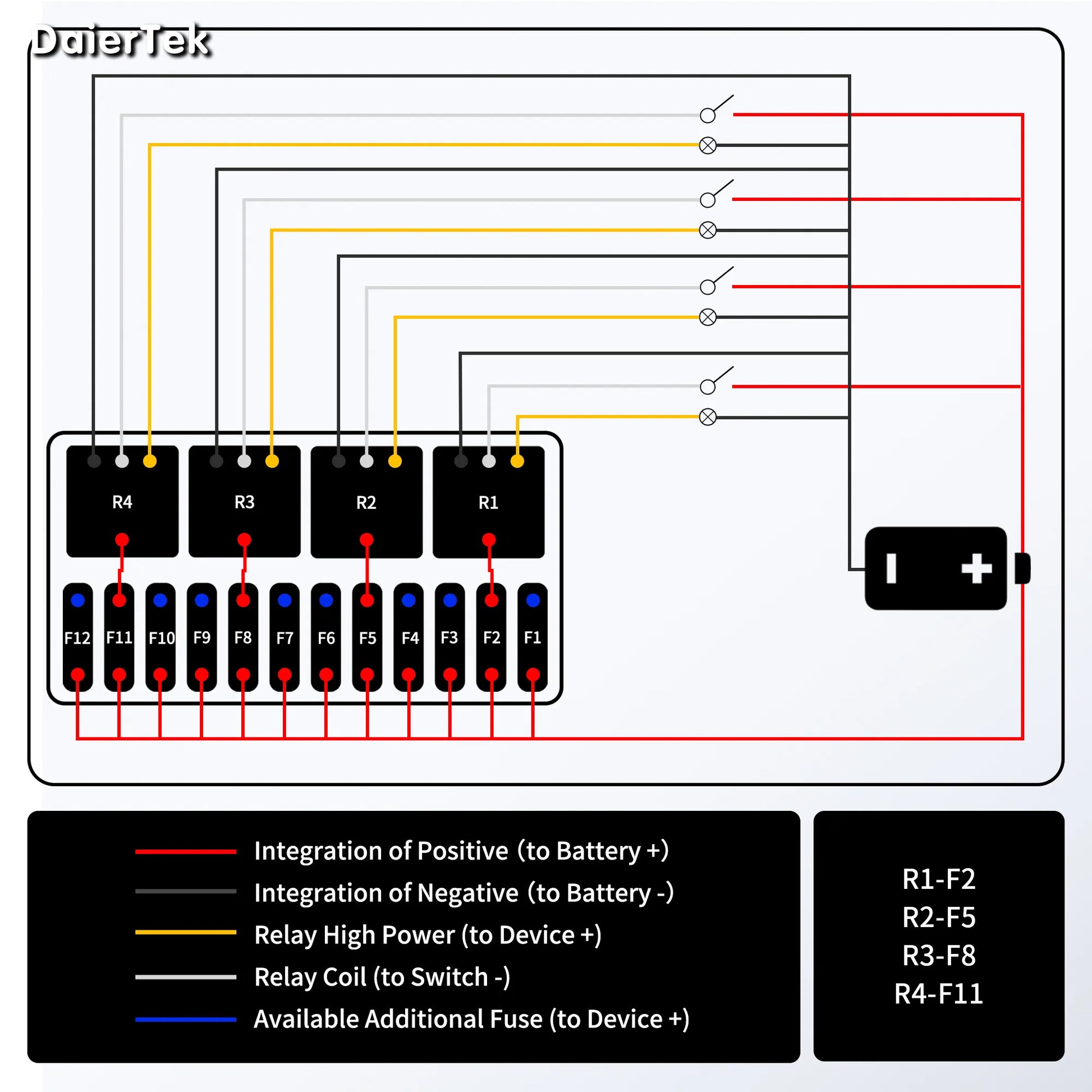 Esta caixa de fusíveis e relés pode comportar no máximo 4 relés e 12 fusíveis ao mesmo tempo, reunindo vários relés em uma única caixa e mantendo seu circuito limpo e organizado.